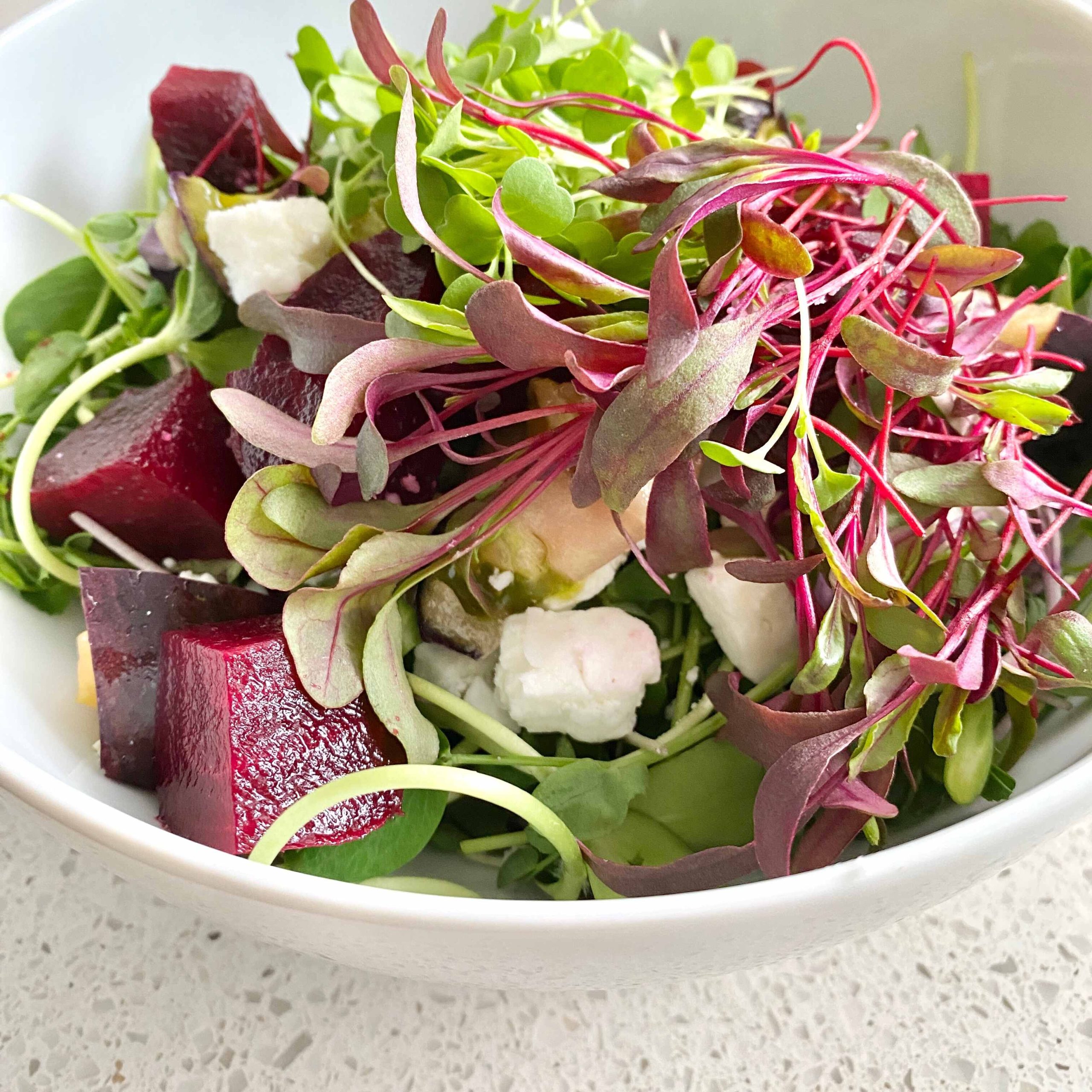 • Top each bowl with chopped beet cubes, a palmful of Beet Microgreens, Feta cheese and Salt & Pepper to taste.